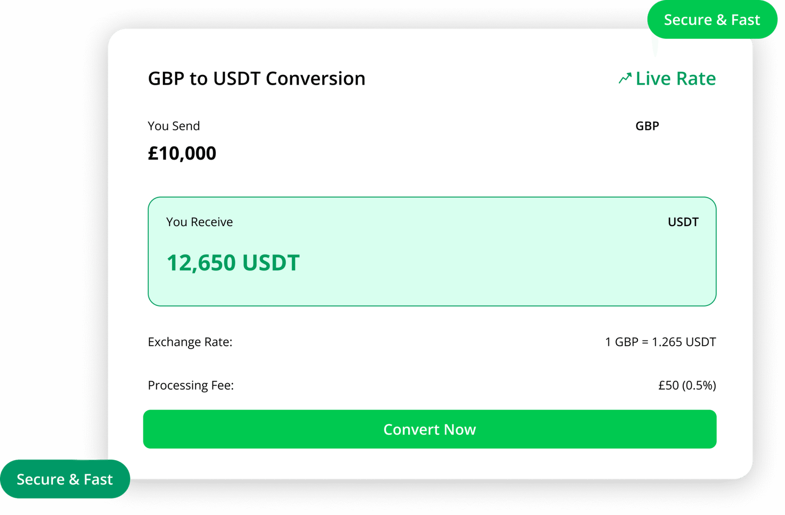 Convert GBP to USDT in minutes, not days. Enjoy lower fees, faster settlements, and complete transparency for your business payments.